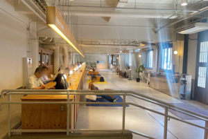 帰り際、ふと見上げた高い天井と大きな窓の向こうに、秋のやわらかな光が差し込んでいました。